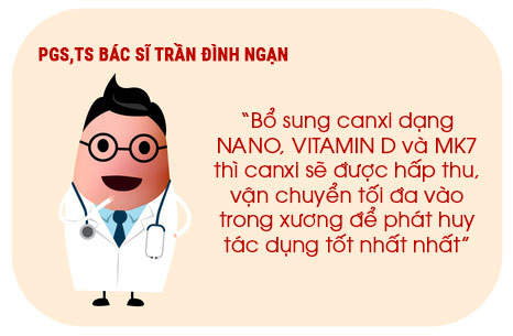 Theo PGS, TS, bác sĩ Trần Đình Ngạn – Nguyên chủ nhiệm khoa tim thận khớp, nội tiết, nguyên PGĐ Quân y viện 103, thì nếu chỉ bổ sung canxi thì chỉ hấp thu được 10% lượng cung cấp, 90% còn lại sẽ dư thừa trong ruột. Trong khi đó, khi bổ sung canxi cùng với vitamin D, sẽ hấp thu được 40% lượng cung cấp. Nhưng nếu bổ sung canxi dạng nano, vitamnD và MK7 thì canxi sẽ được hấp thu, vận chuyển tối đa vào trong xương để phát huy tác dụng tốt nhất.